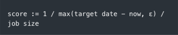 But there is a further step to do: we want to avoid dividing by zero if today is the target date, or negative scores when we are past the deadline. So we use