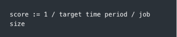 This way, all aspects of value are captured by a simple-to-assess number: a target time period. Actually, the value is the inverse of the time period (the shorter the time we have, the more valuable the job is), so the WSJF scoring becomes: