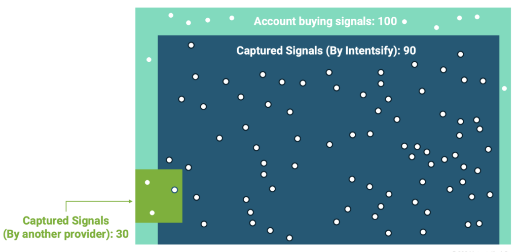 To understand the implications, consider an example: In a given week, a target account might generate 100 buying signals around a specific solution. A robust intent data provider with numerous, differentiated intent sources could capture a large percentage of these signals, say 90. This provides a strong indication of the account’s interests and readiness. A provider at the lower end of the signal-volume range might only capture just 3 signals.
