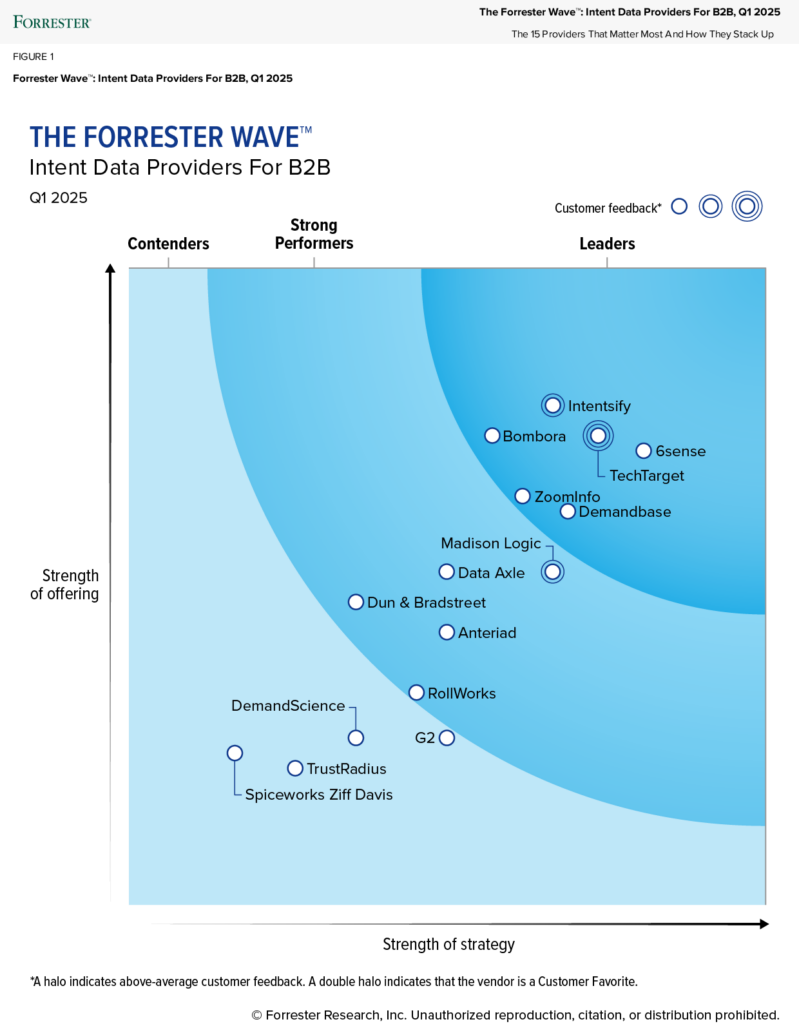 We’re thrilled to announce that Intentsify has been recognized as a Leader in The Forrester Wave™: Intent Data Providers For B2B, Q1 2025. This comprehensive analysis evaluated 15 providers across 21 categories, with Intentsify receiving the highest score possible in 12 categories — the most of any provider — and the highest overall score for “strength of offering.”