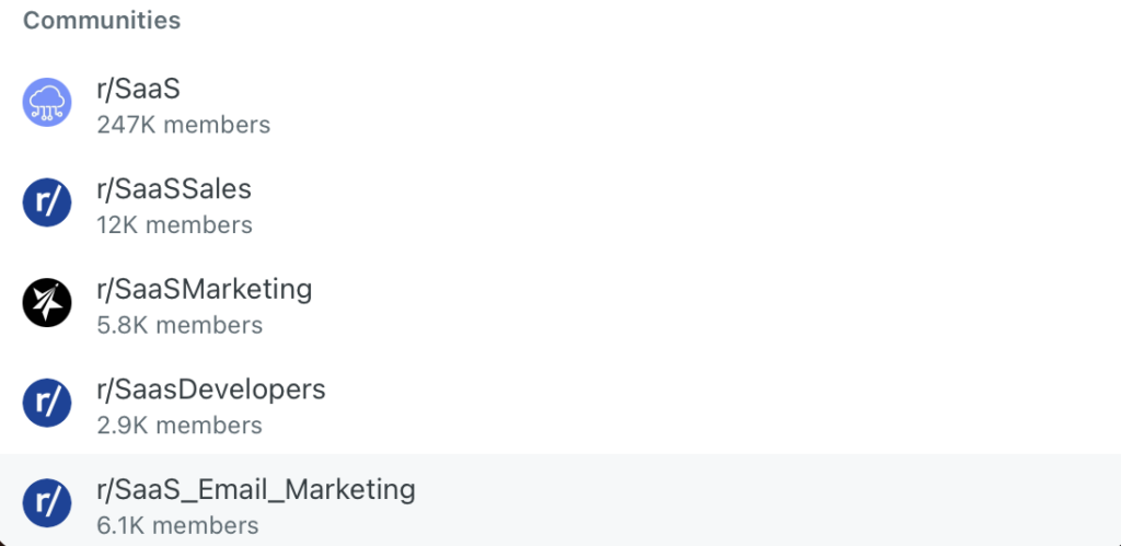 You can find the communities you’re looking for by typing keywords into Reddit’s search bar. For instance, if you are focusing on SaaS lead generation, typing “SaaS” into the search bar brings up a list of existing communities, each with thousands of members.
