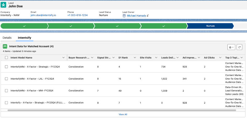 The Intentsify Salesforce Integration provides detailed reporting on accounts and leads showing intent, insights into account activity and engagement levels, and a revenue-impact dashboard. This seamless integration empowers teams to make data-driven decisions and act on intent signals in real-time, ultimately shortening sales cycles. It also helps GTM teams demonstrate the value of intent data by quantifying its impact on pipeline and revenue generation.
