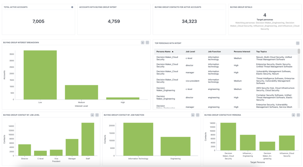 - Buying Group Insights: We provide detailed information about research behaviors across key personas. This offers a more holistic view of collective interests and buyer research stage.