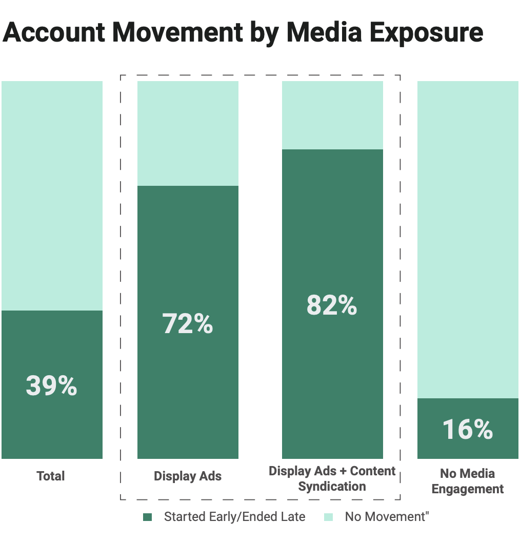 The findings showed that target accounts exposed to both display ads and content syndication advanced further through the buyer’s journey than accounts with no media engagement or single-channel exposure.